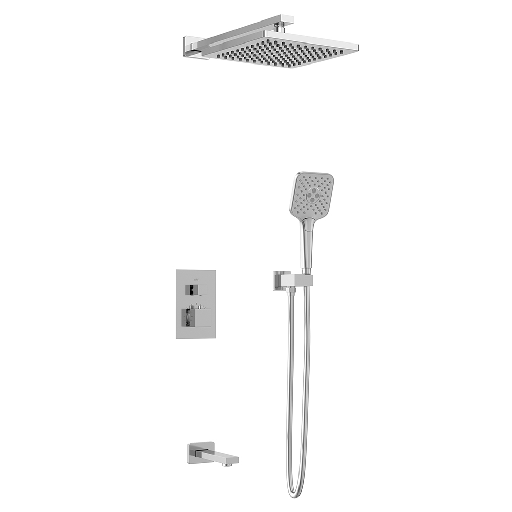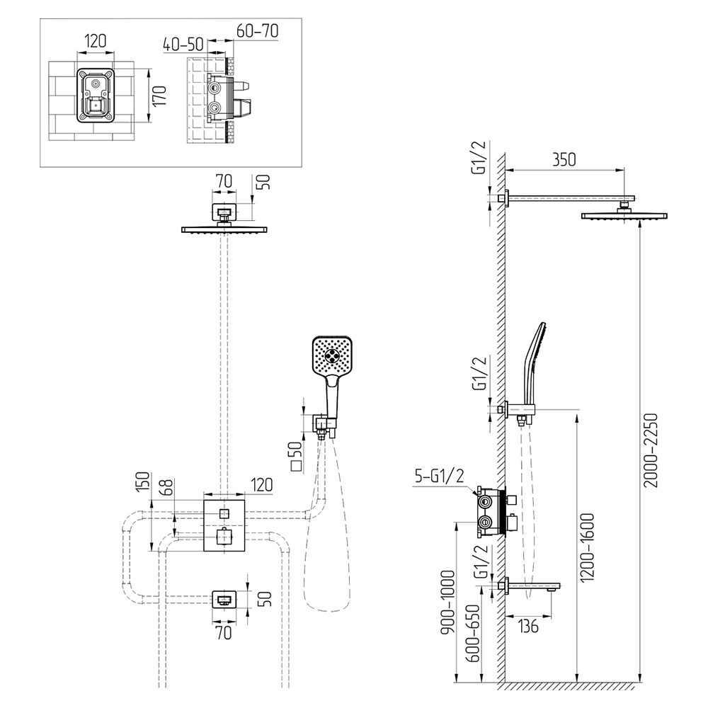 термостат; монтажная часть; верхний душ; кронштейн для верхнего душа; излив; шланговое подключение; ручной душ; душевой шланг; инструкция.
