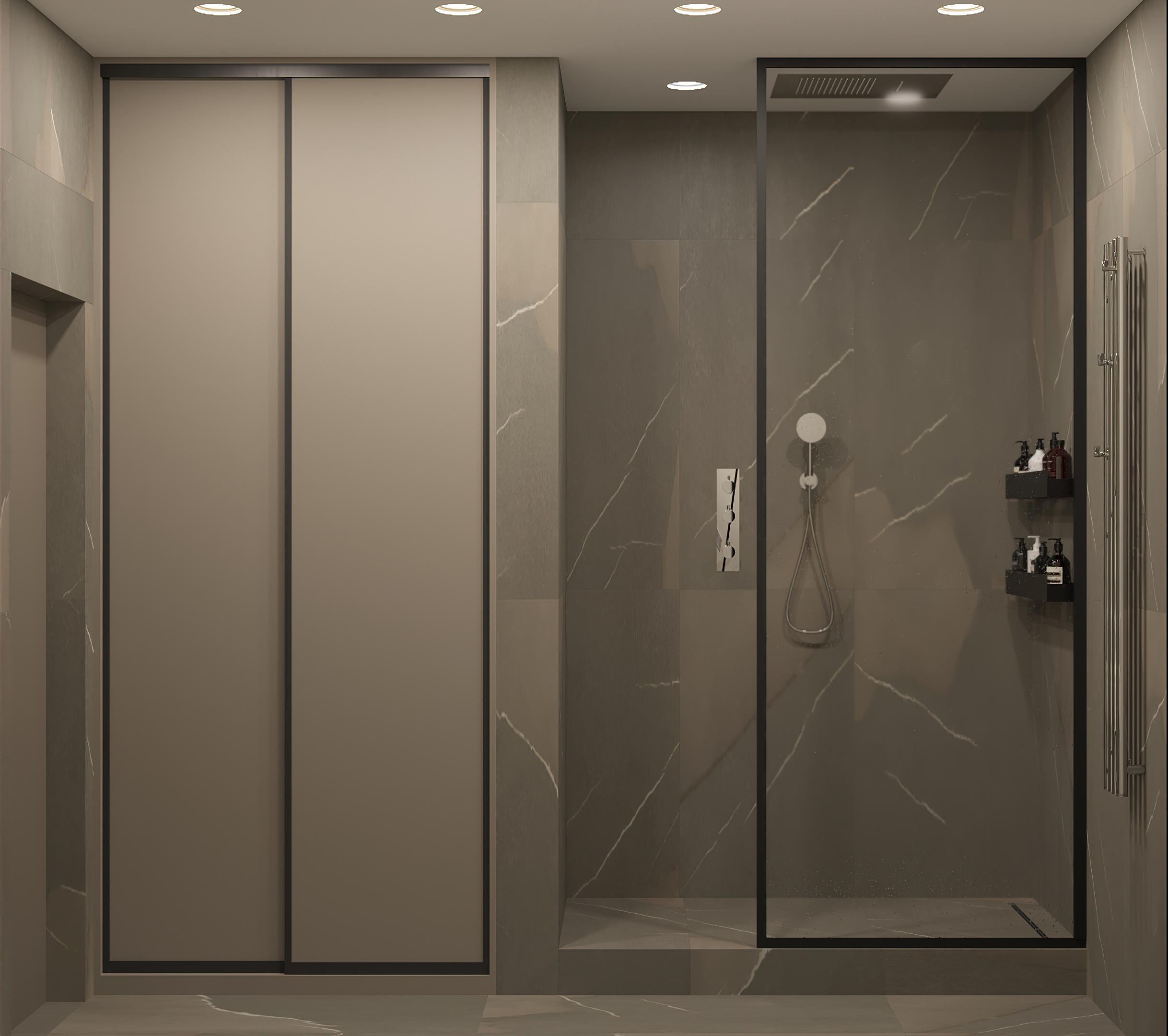 Описание: главной задачей интерьера было создать простые формы мебели и декора, которые будут смотреться легко и при этом, являясь функциональными. Цветовая гамма сложных серо-бежевых оттенков, как хамелеон, перенимает температуру освещения, создавая неповторимый эффект. Белые и черные акценты дополняют интерьер контрастами.